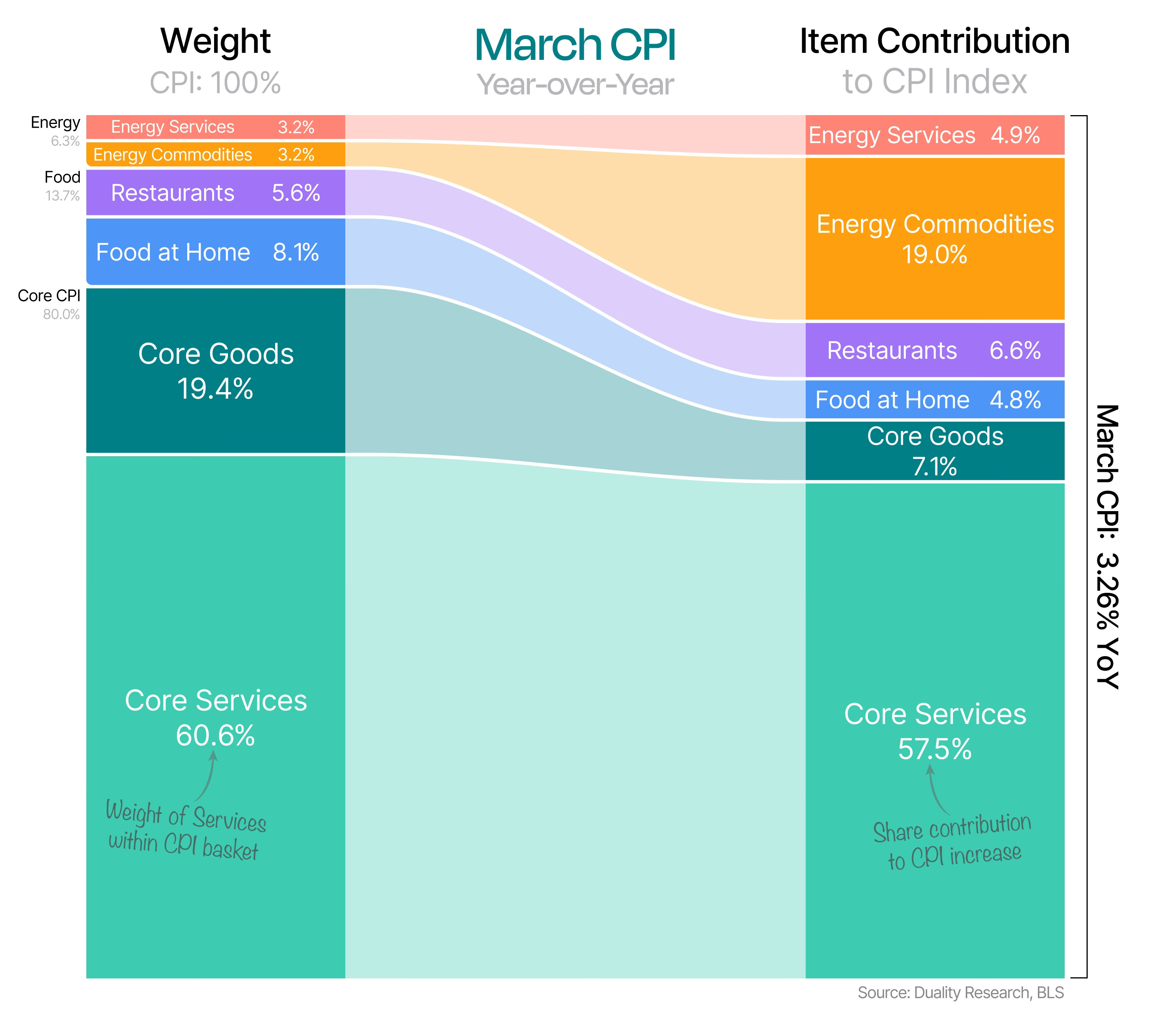 Let’s start with our chart that shows the weight of the three main CPI categories and their respective sub-groups on the left. On the right, you can see how each item contributes to the overall index.