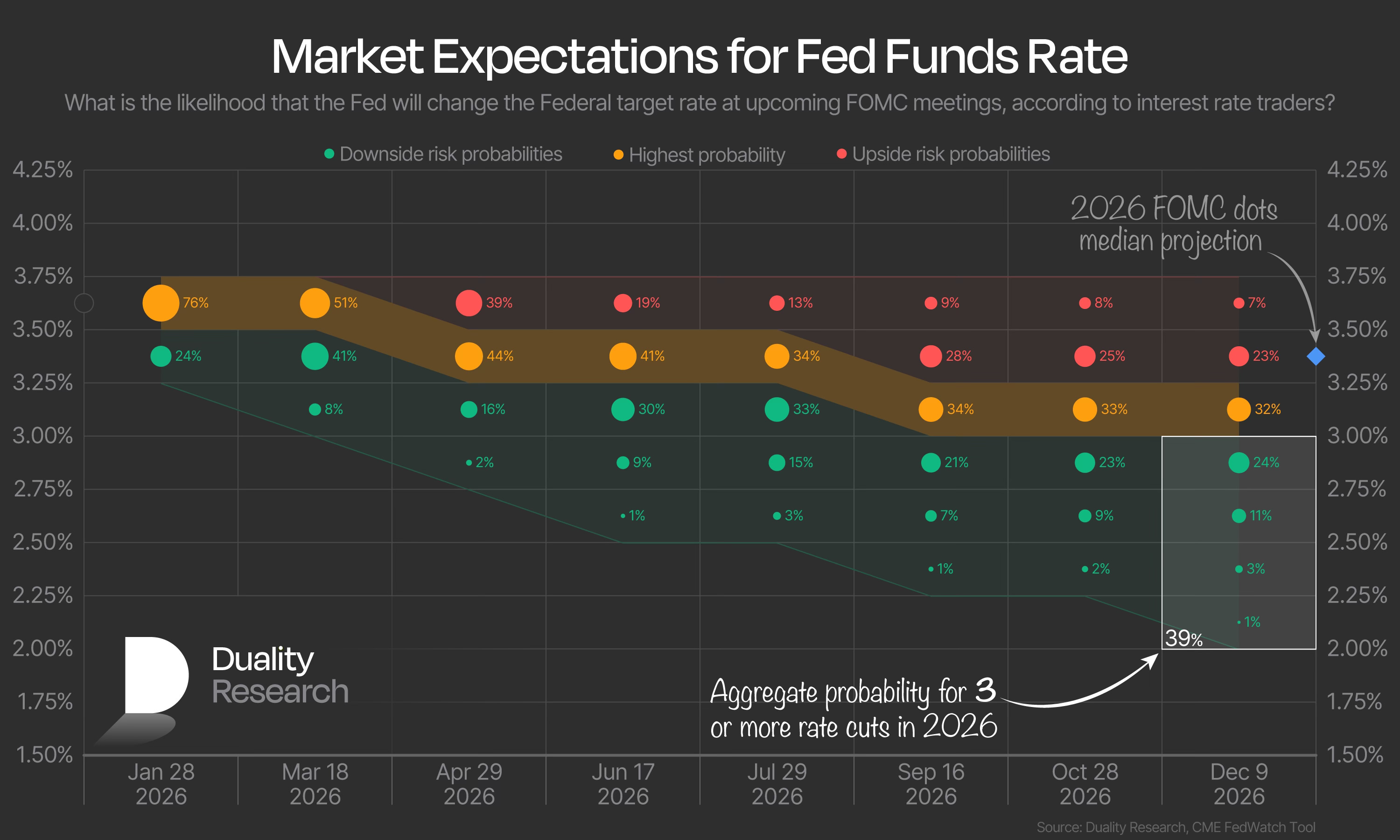 Following last week’s dovish rate cut, Fed Funds Futures are pricing in two more cuts in 2026, with a 39% probability of even deeper easing. But with Powell stepping back in May, and Hassett likely to take over as Fed Chair, there’s still a lot that could shift.