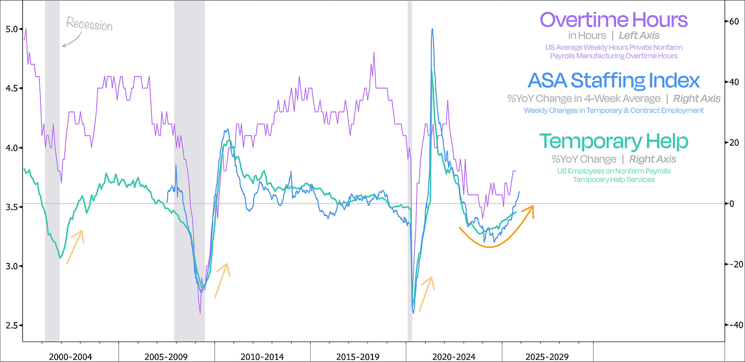 Historically, these are classic early-cycle signs: businesses see more activity, so they add hours and temps before committing to costly full-time hires.