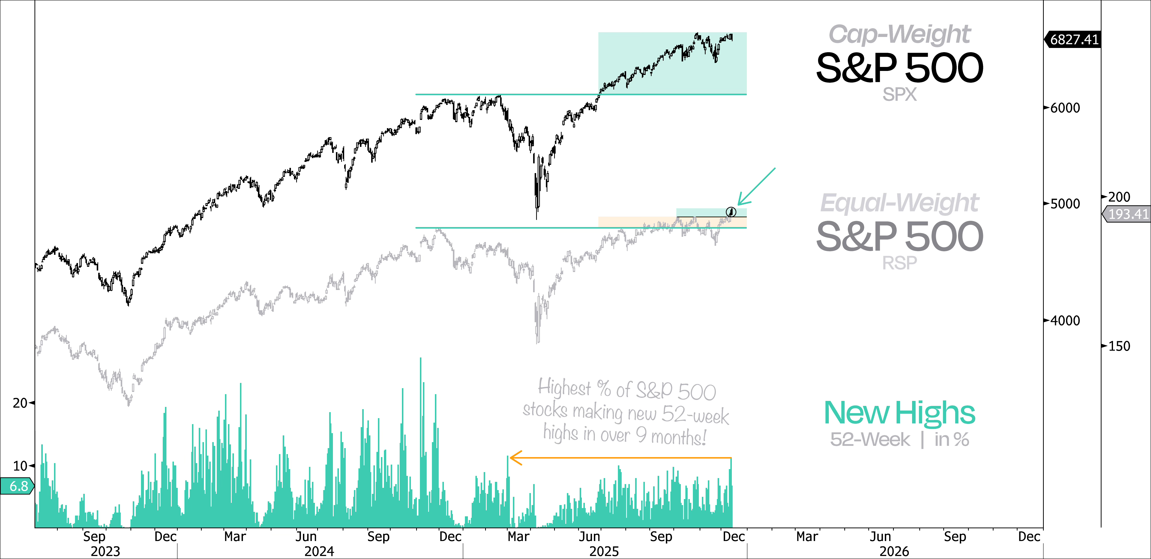 Take a look at this next chart showing the S&P 500 on both a cap- and equal-weighted basis, along with the percentage of stocks hitting new highs.