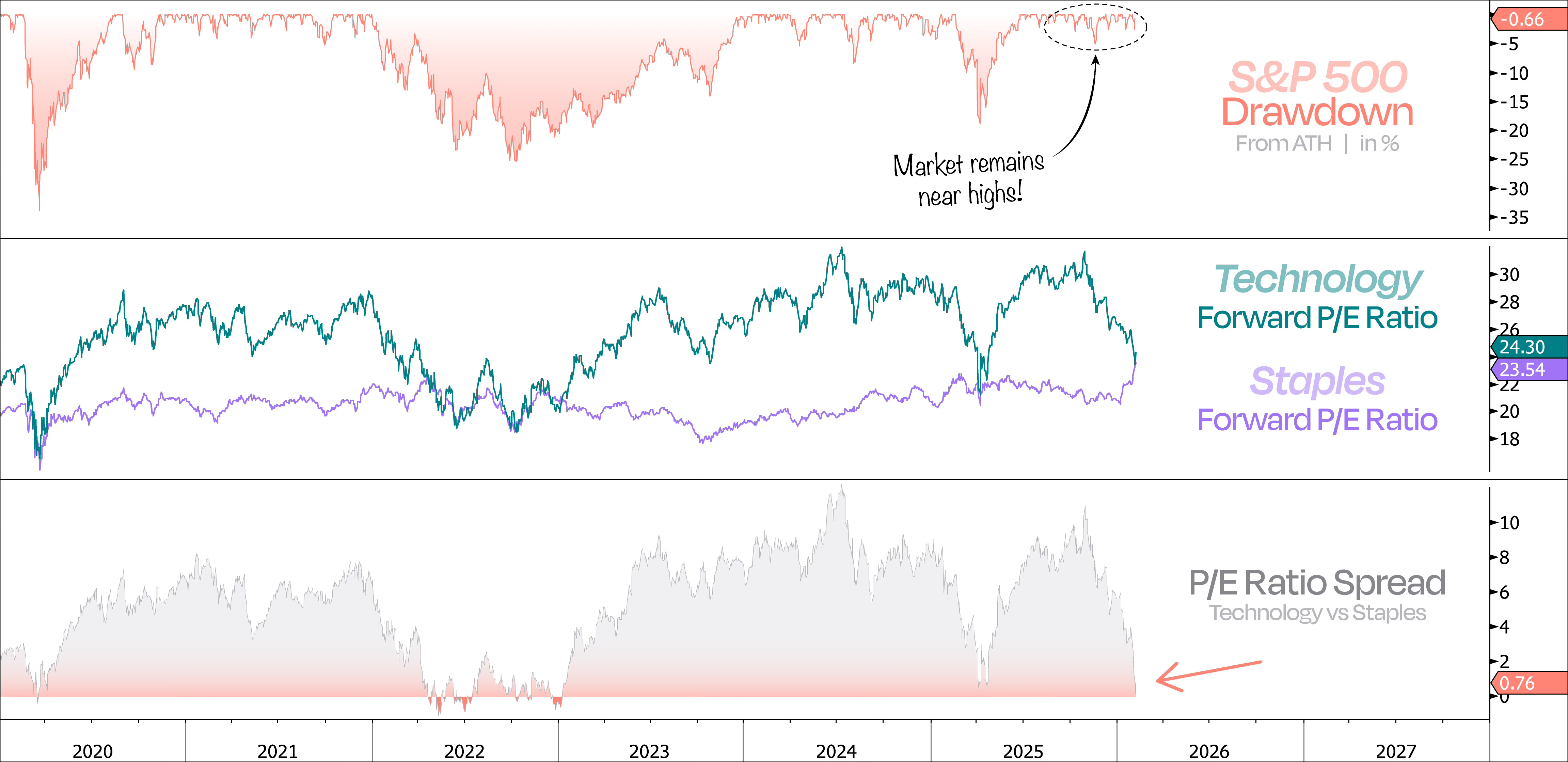 After an 8-point compression in Tech’s P/E, the two sectors are now trading at similar multiples, something we usually only see around major market drawdowns, as the chart below shows.