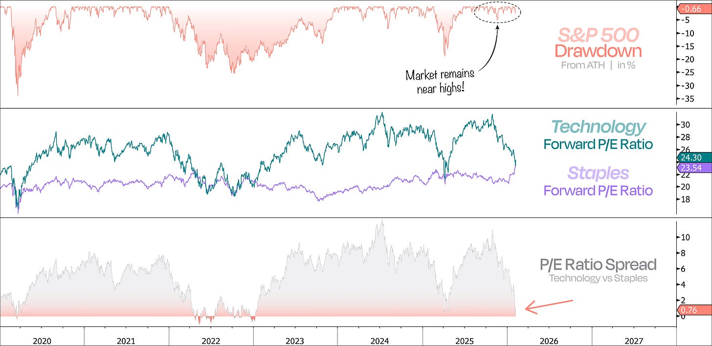 Another way to see how far the pendulum has swung is by comparing valuations in Tech vs Staples — keeping in mind we’re still in a bull market.