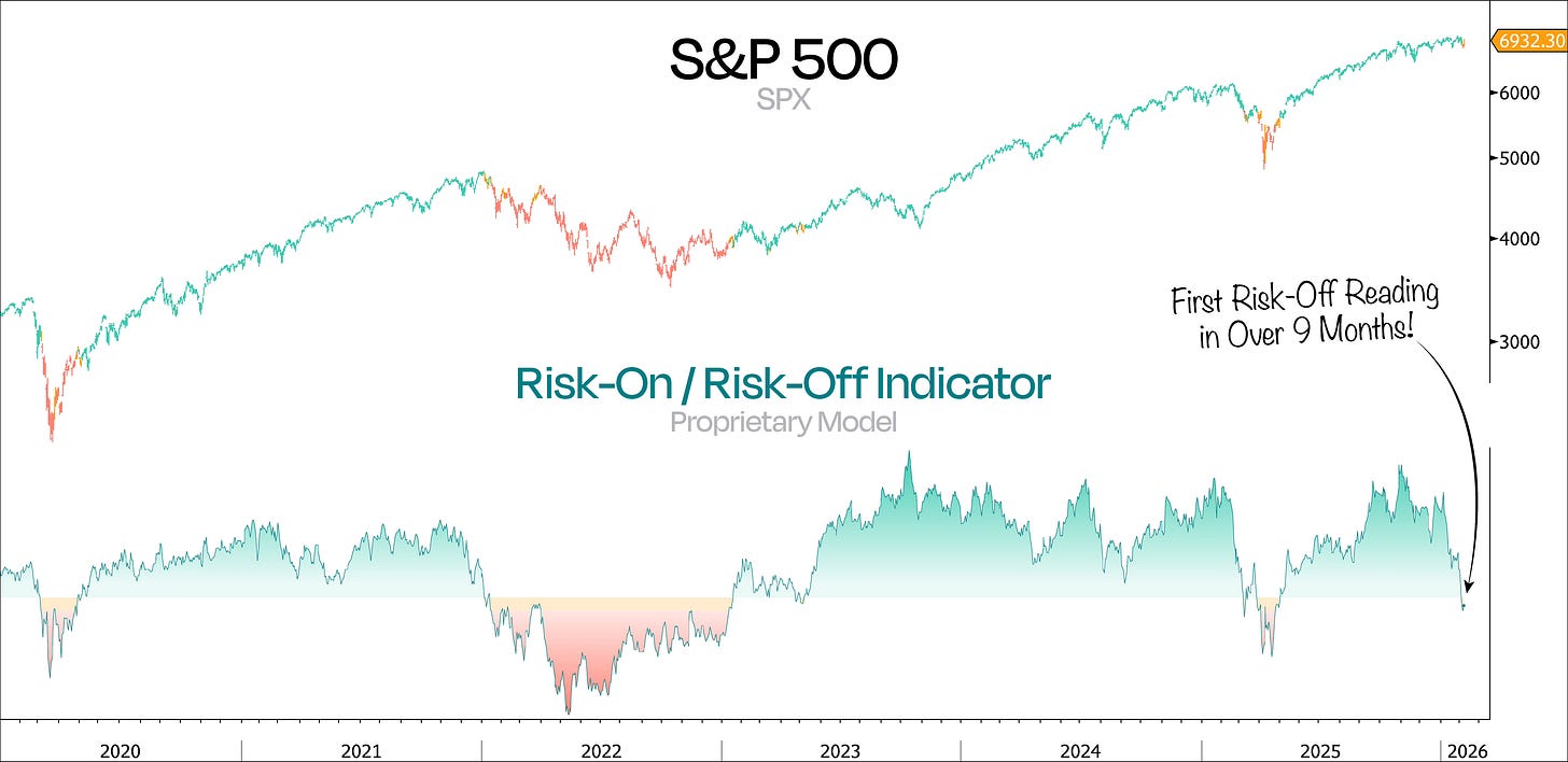 Now, while all of this sounds good, something bigger is clearly going on beyond just Tech’s weakness. After all, our Proprietary Risk Appetite Model flipped to risk-off last week for the first time since April 2025, as our chart below shows.