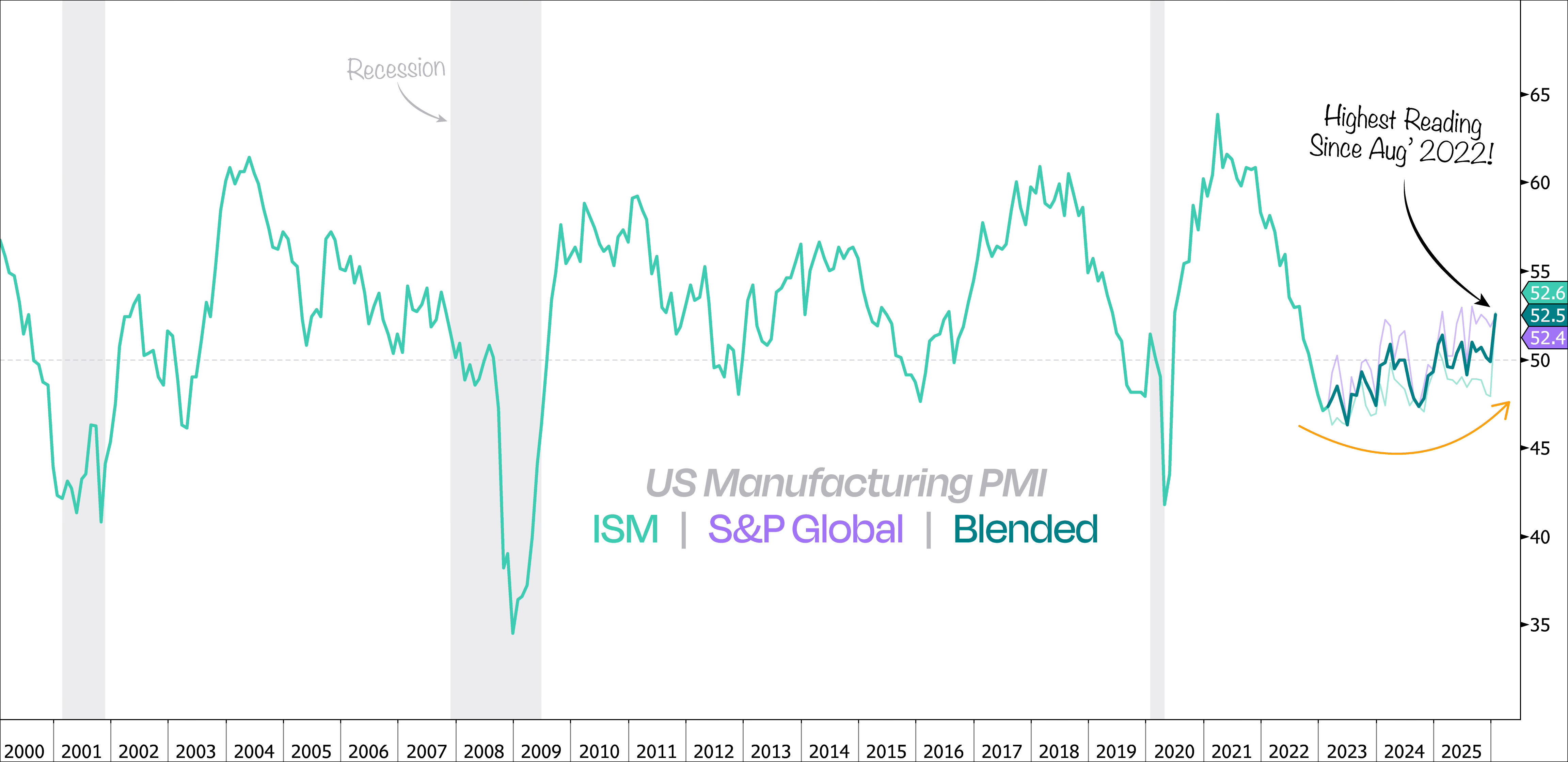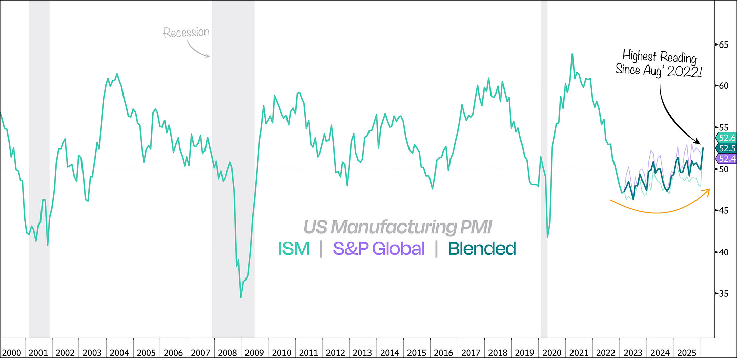Finally, you can see it in the data, too — last week’s ISM print basically screamed reacceleration. The long-term chart below puts it in perspective, showing the ISM Manufacturing PMI since 2000, along with the average of the ISM and S&P Global US Manufacturing PMI since 2023.