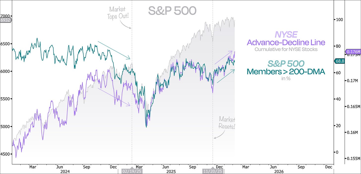 Since the November reset, the market of stocks has really been doing just one thing: broadening out. You can see it clearly in the next chart through the NYSE cumulative advance-decline line and the number of S&P 500 stocks trading above their 200-day moving average.