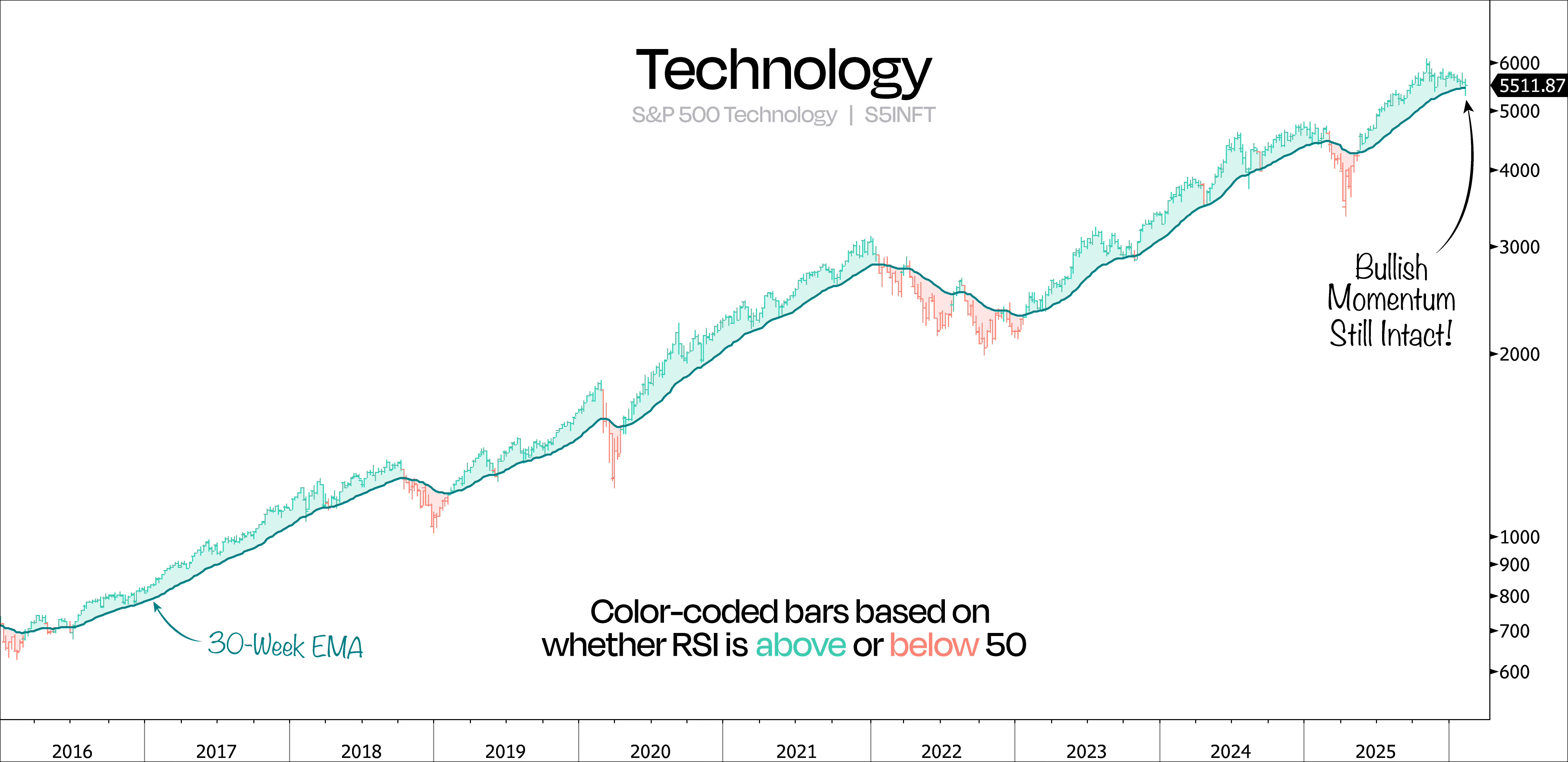 As for Friday’s bounce, it’s hard to say whether that was the market coming to its senses or just a textbook oversold rally — probably the latter. Either way, Technology bounced at an important level and, for now, remains in bullish momentum territory, with weekly RSI above 50, which also lines up pretty closely with whether price is above or below the 30-week EMA.