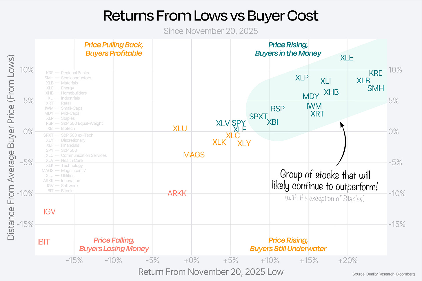 Near term, the oversold pockets since the November 20 reset should bounce harder. But over the next six months, we still like the parts of the market tied more closely to the real economy. Think small-caps, Industrials, Regional Banks, Homebuilders… and really anything equally weighted.