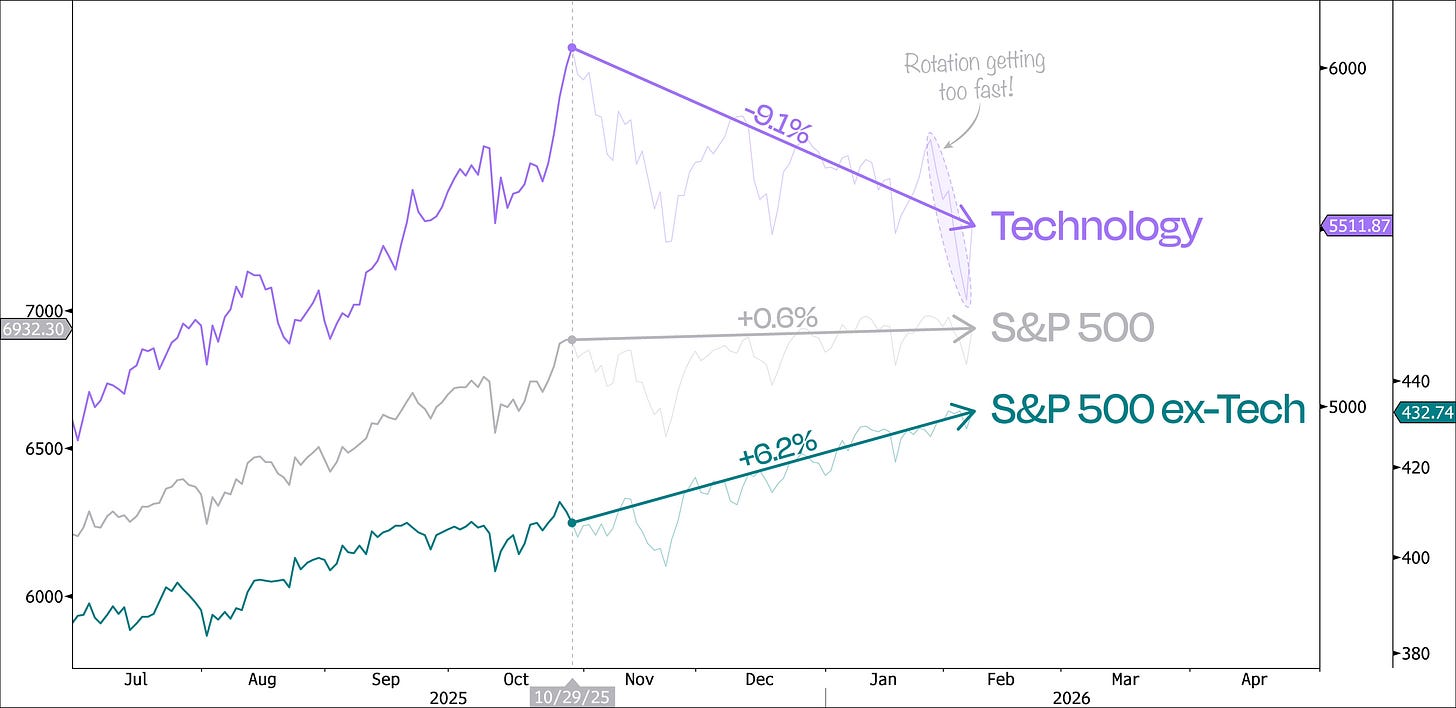What the market just showed is that rotation out of Tech is not about how far it can fall before spilling into the rest of the market — it’s about how fast it can happen.
