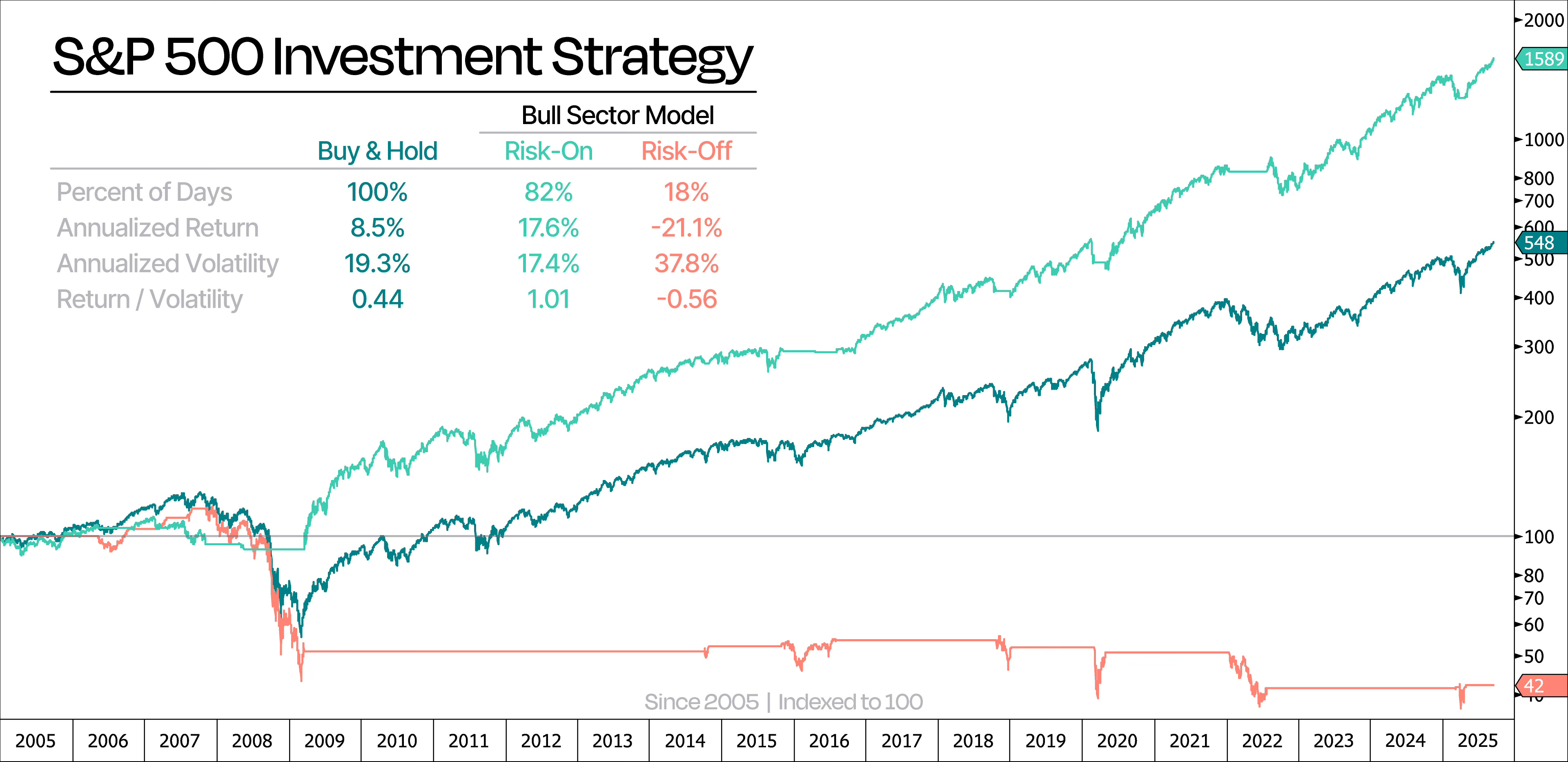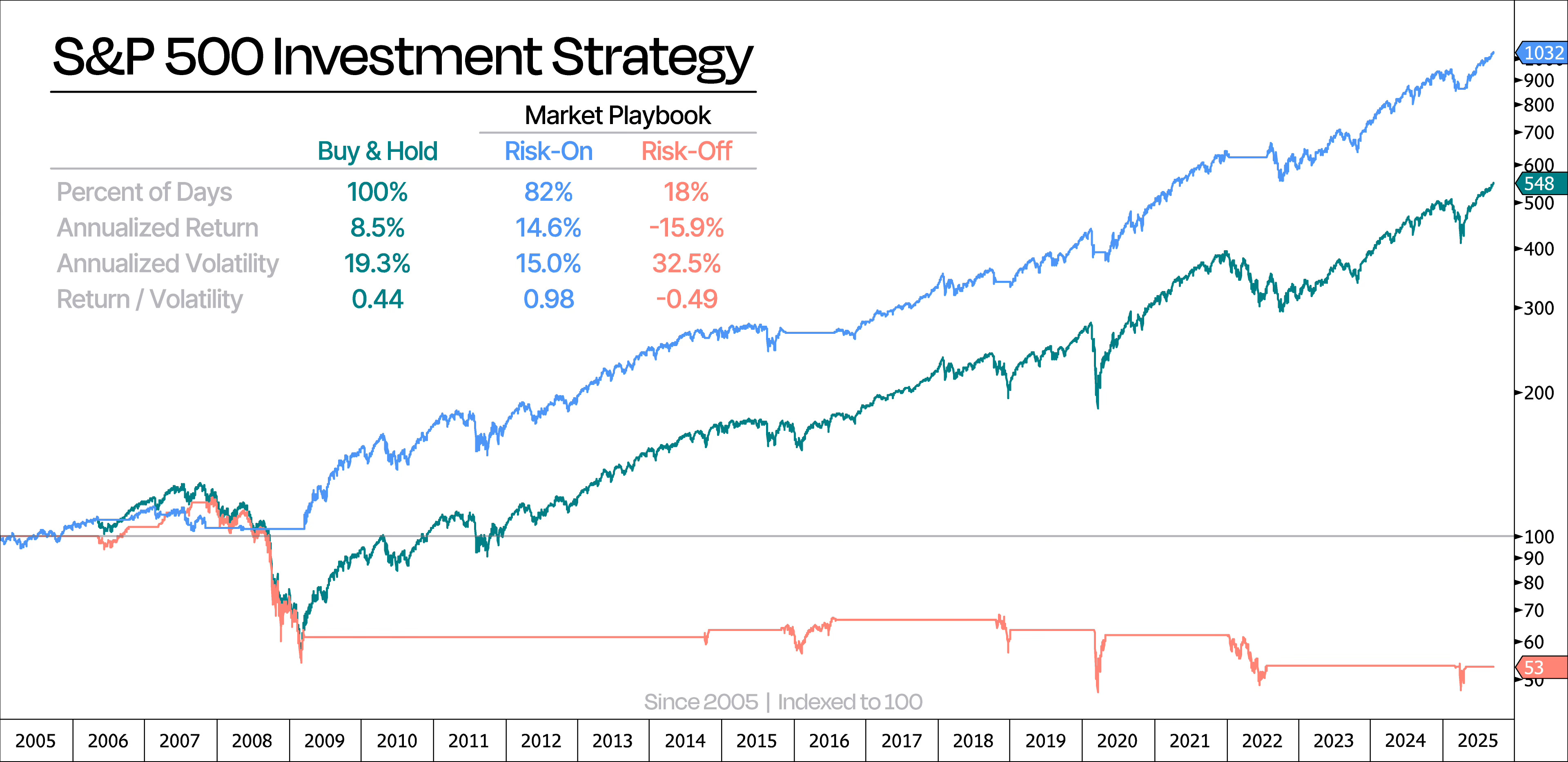 Take a look at the next chart. It shows our combined strategy, alongside the classic buy-and-hold approach. As you can see, this strategy keeps us in the market much longer — around 82% of the time — squeezing out the most net gains while largely avoiding periods of extreme market stress.
