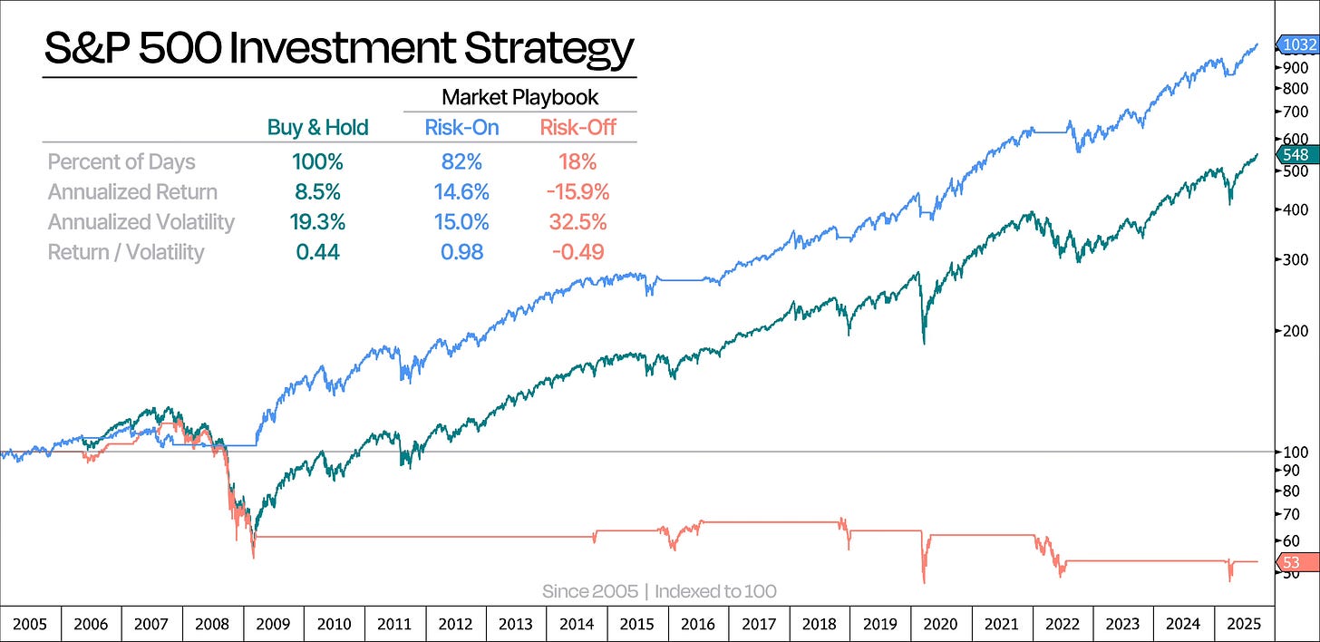 Compared with plain buy-and-hold, we can see that our Market Playbook returns more than double the return per unit of volatility — in other words, double the bang for your buck in return per unit of risk.