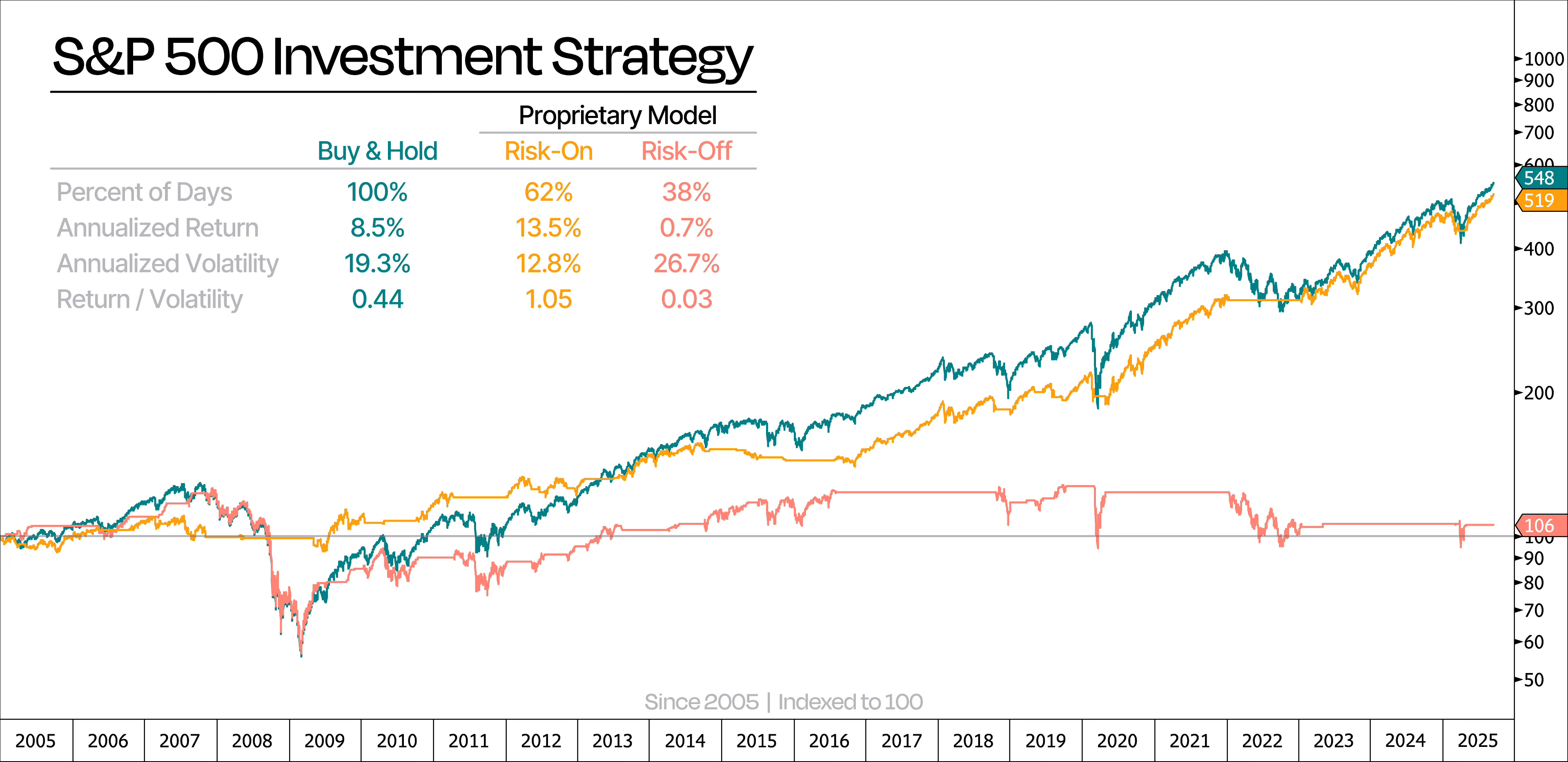 Take a look at the chart below. It compares S&P 500 returns from a plain buy-and-hold approach vs following our model’s signals. While our model hasn’t strictly outperformed the buy-and-hold approach, it has captured almost all of the S&P’s net gains — despite being invested only 62% of the time.
