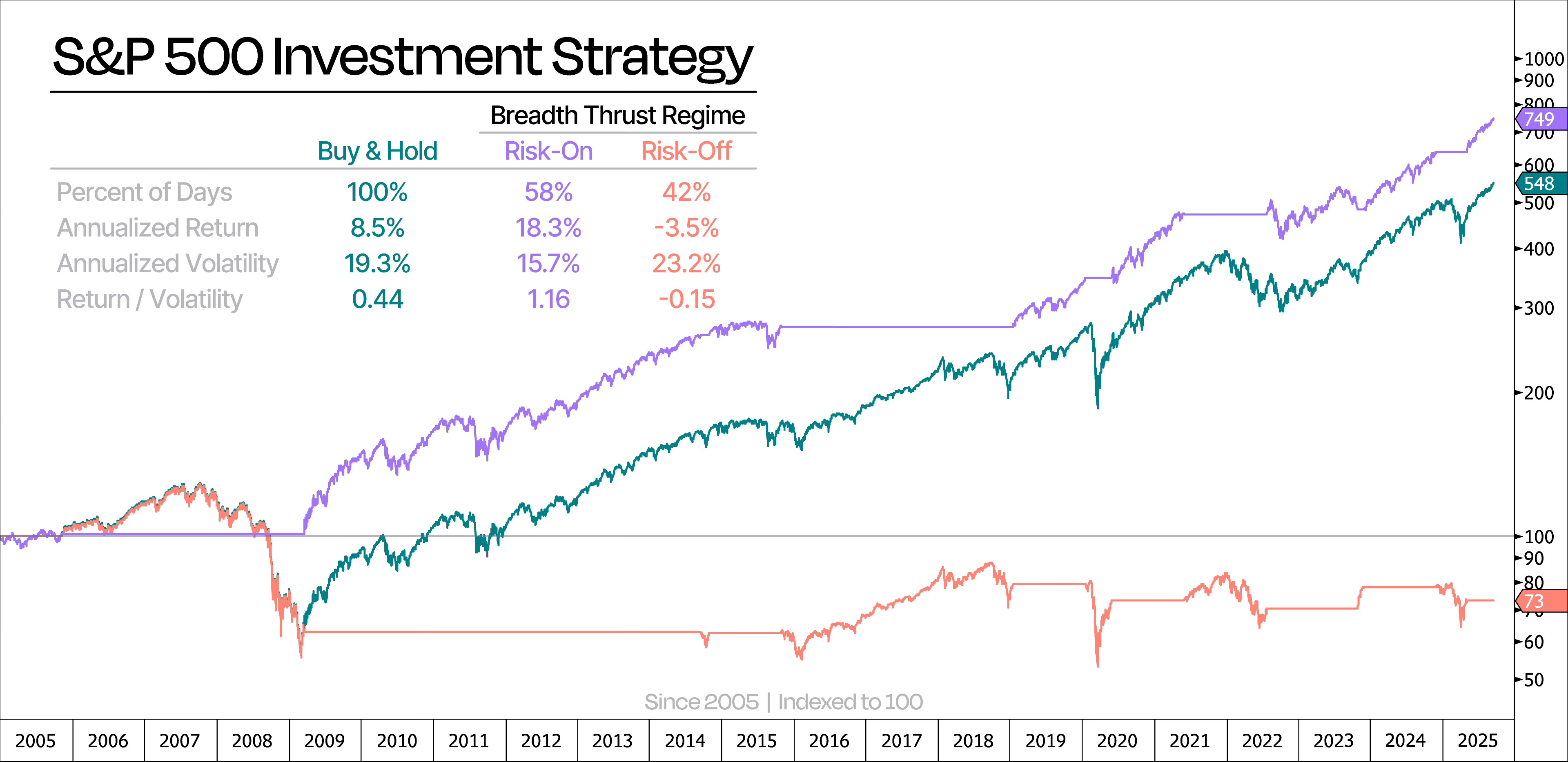 Take a look at the chart below. It compares the S&P 500’s performance under a buy-and-hold strategy vs investing only during Breadth Thrust Regimes. Amazingly, the Breadth Thrust approach has outperformed buy-and-hold while being in the market just 58% of the time — only about 12 years since 2005.