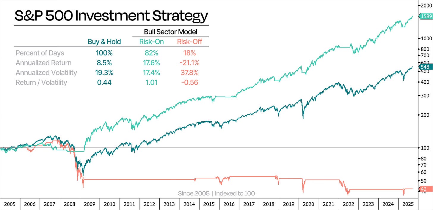 The results speak for themselves: even though the Bull Sector Model invests only during the same risk-on periods as our Market Playbook, it delivers higher annualized returns and even slightly better risk-adjusted performance.