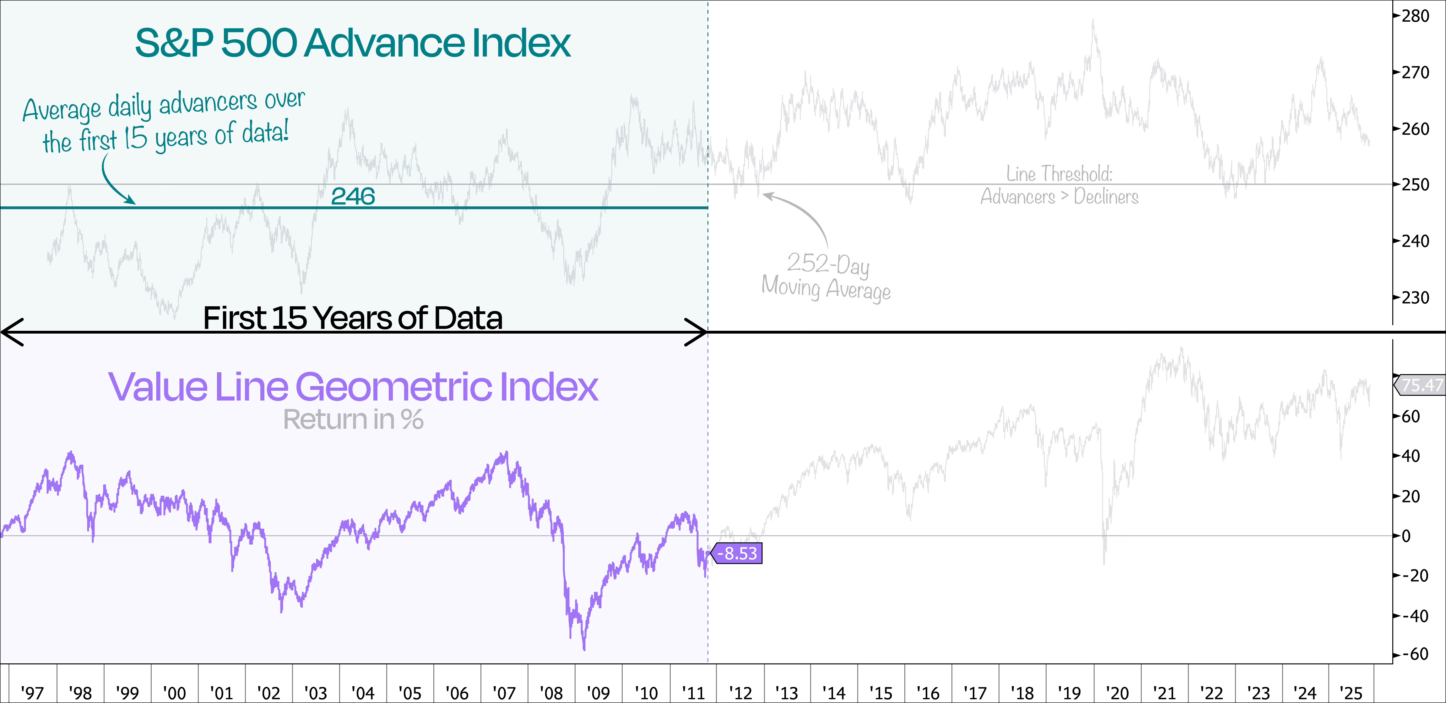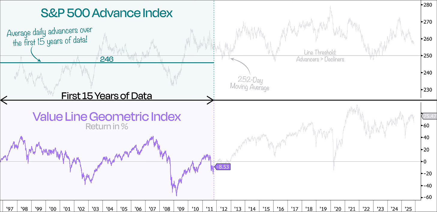 Indeed, when we plot the average daily advancers over those first 15 years, the S&P 500 averaged just under 246 advancers per day — meaning that, on average, more stocks were falling than rising each day.