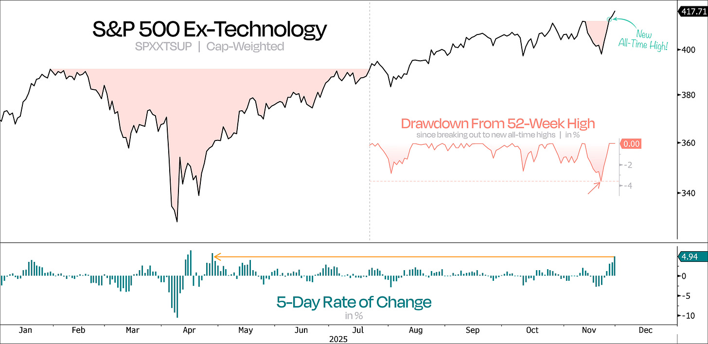 As our next chart shows, excluding the Technology sector, the broader market looked ready to roll over. But thanks to recent developments, the S&P 500 Ex-Tech Index hit new all-time highs — just three days after experiencing its deepest pullback since its July breakout.