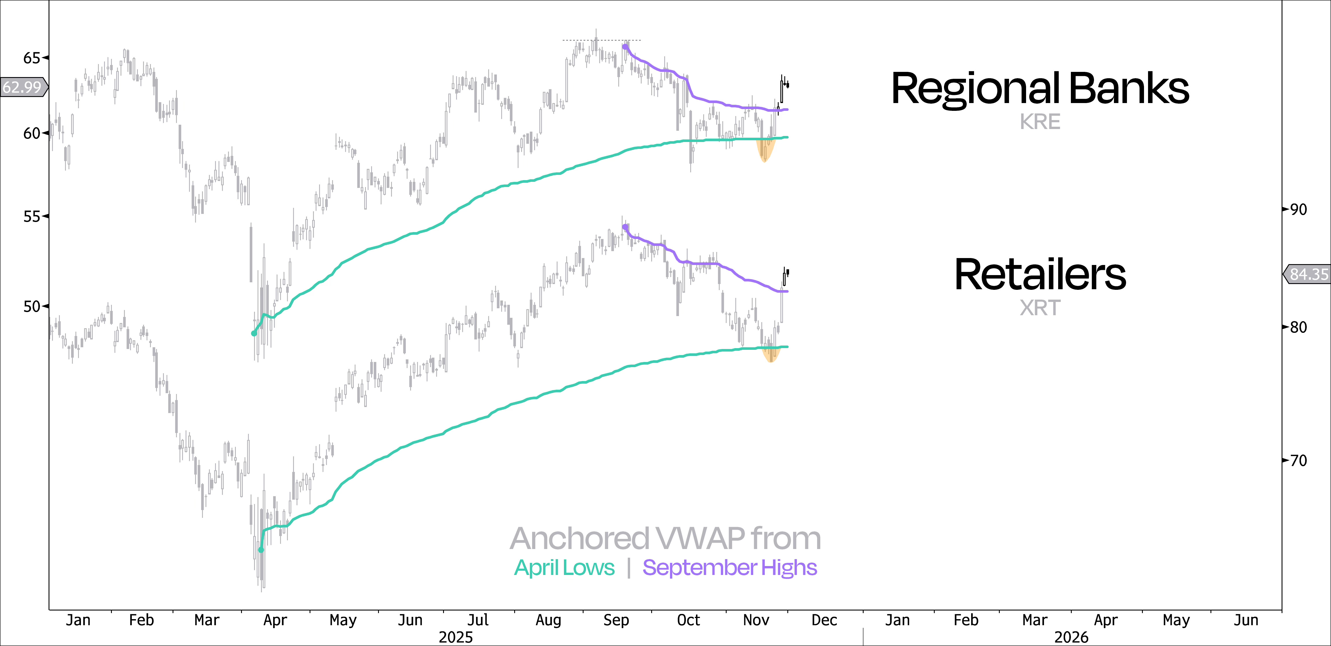 Take Regional Banks and Retailers, for example. They dipped below their anchored VWAPs from the April lows, only to catch massive momentum and swing back above their anchored VWAPs from the September highs.