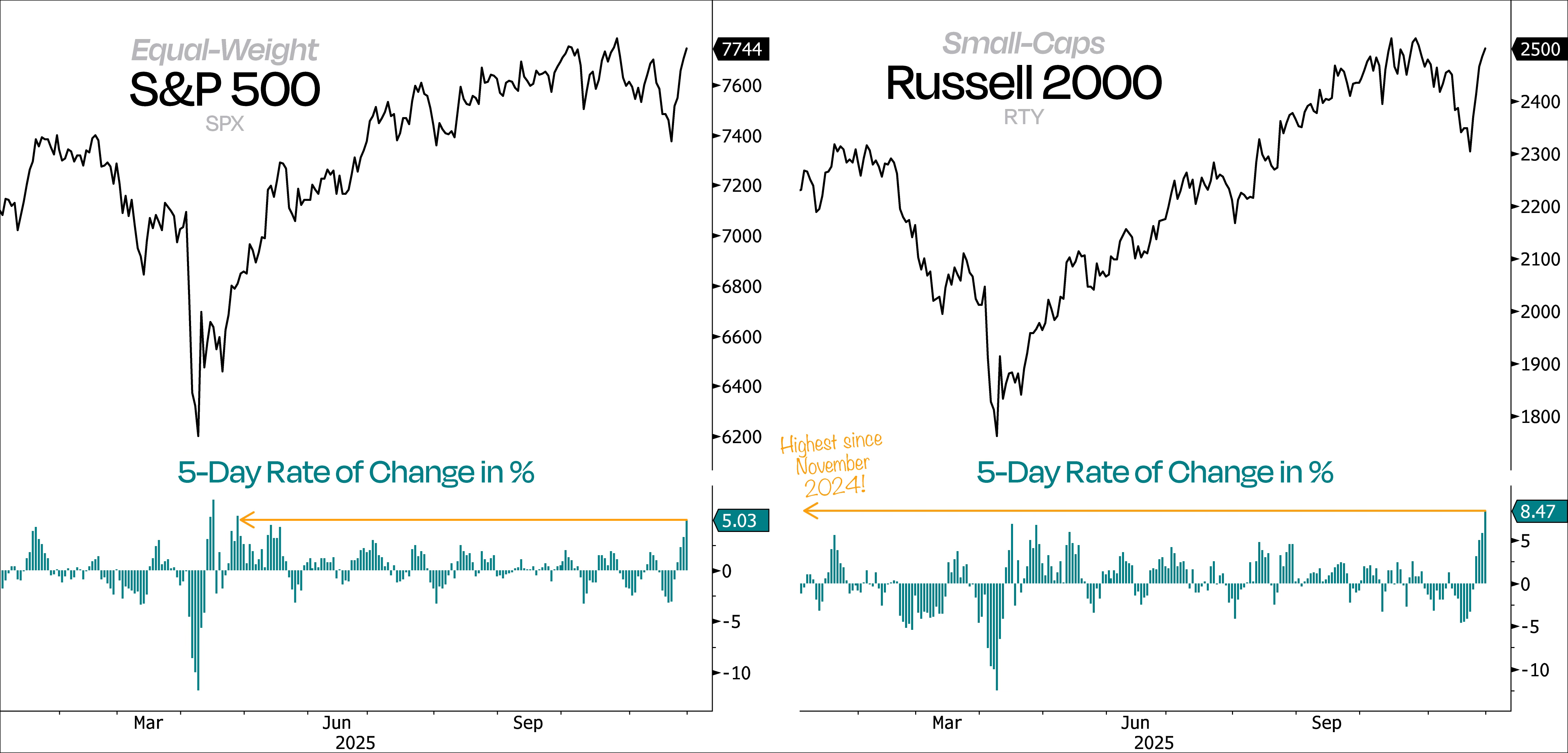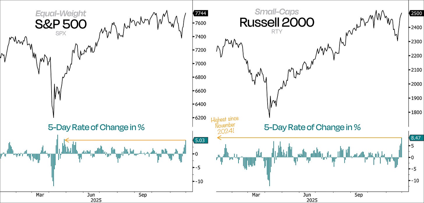Not only did it happen, but it’s happening so broadly and on such heavy volume that this isn’t just an oversold bounce — it’s a genuine buying thrust. The best way to show this is by checking the 5-day rate of change in the equal-weight S&P 500 and the Russell 2000.
