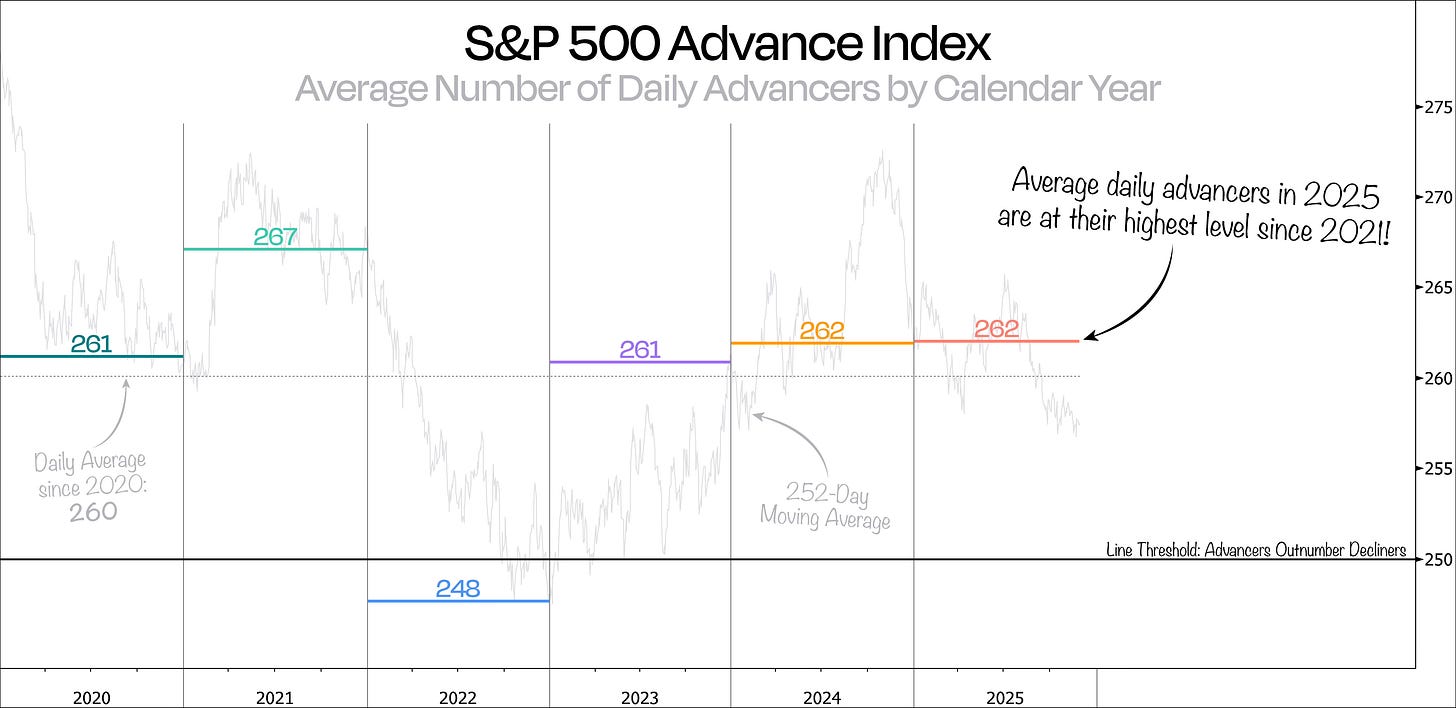 By that measure, 2025 is looking strong — the average daily advancers are at their highest since 2021. In other words, market participation during this bull market hasn’t been as strong as it is this year.