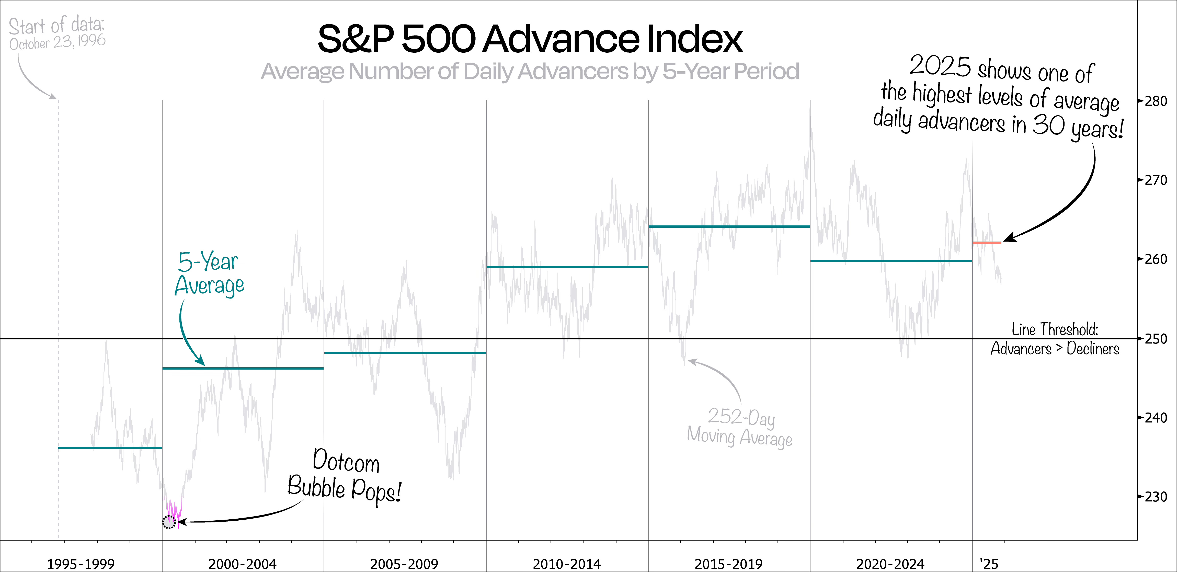 While the data set covers nearly 30 years, we can’t help but notice that the first half largely stayed below the threshold line of 250, where advancers begin to outnumber decliners.