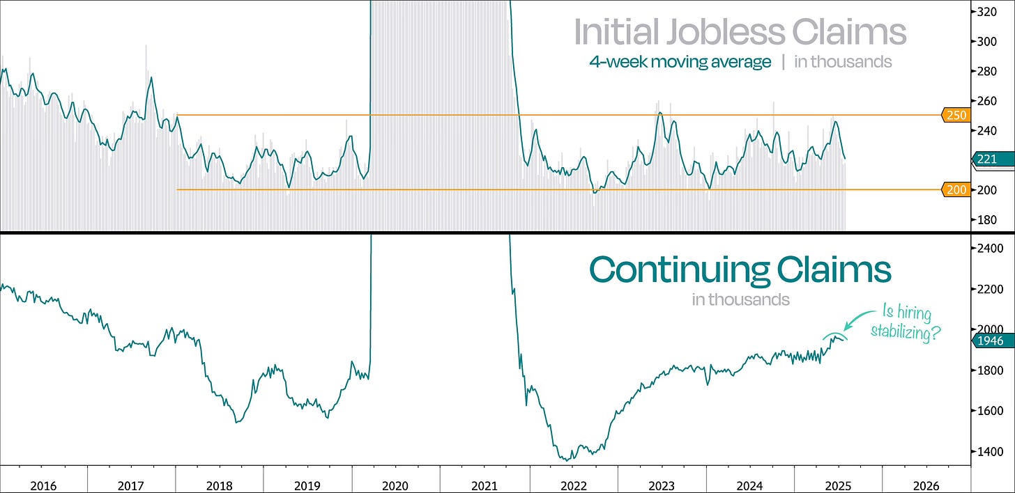 Instead, looking at weekly Jobless Claims, which give a more real-time view of employment trends, it’s safe to say that layoffs aren’t picking up. In fact, initial claims are still cruising in that healthy 200k–250k range.