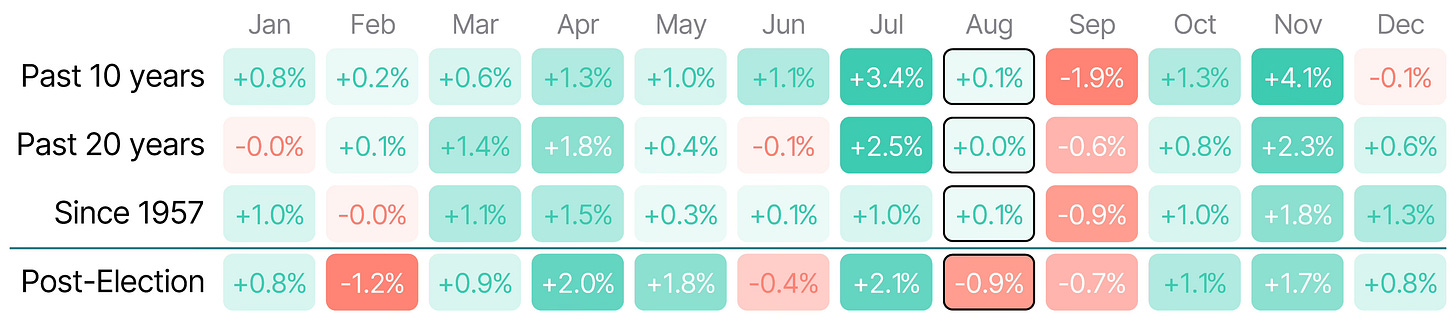 Stocks have indeed looked stretched lately, with the S&P 500 spending much of July in overbought territory. And those seasonal warnings aren’t just noise — August and September have a track record of being weaker, especially in post-election years.