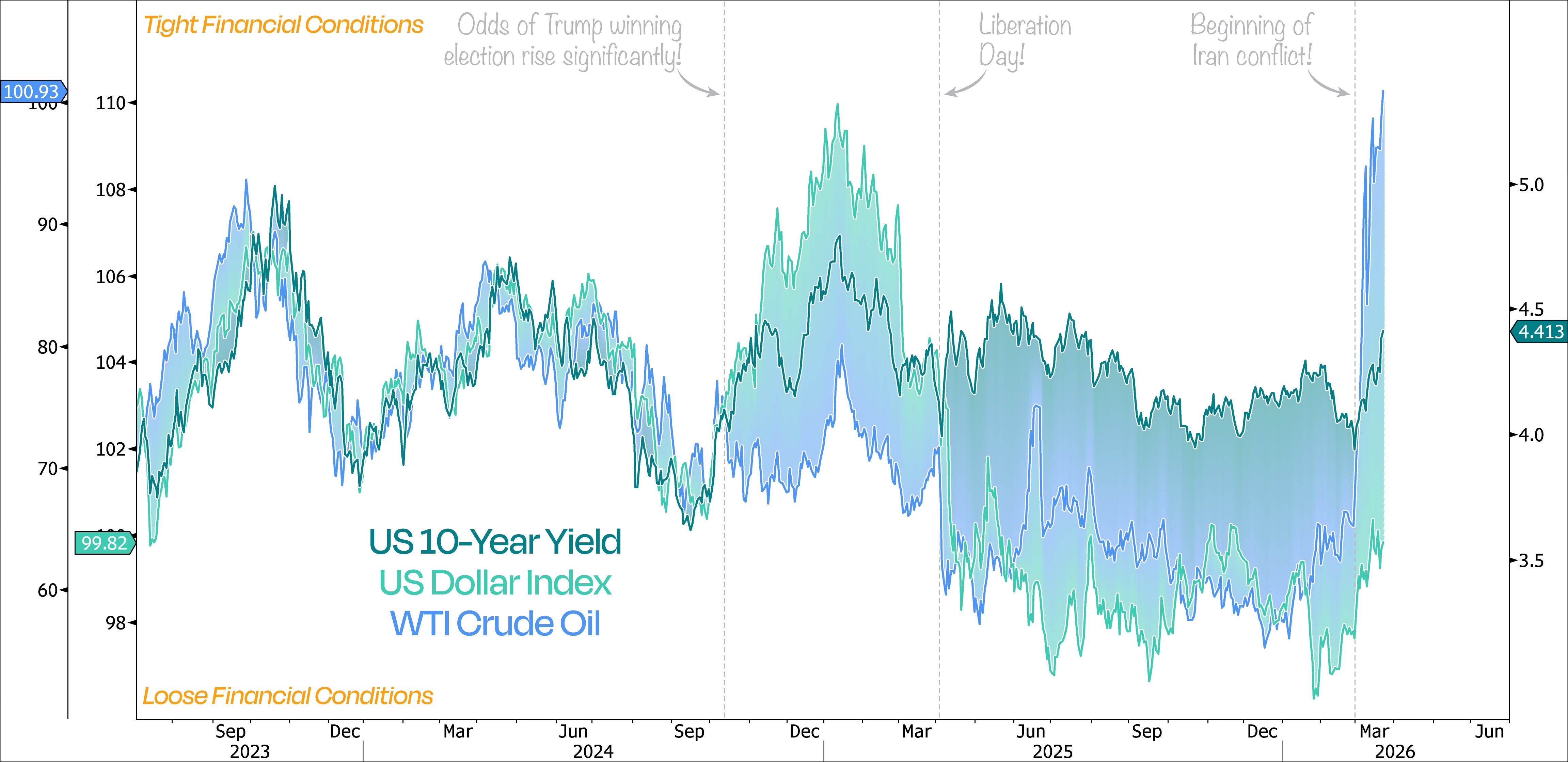 Financial conditions are essentially a function of interest rates, oil prices, and the US dollar.