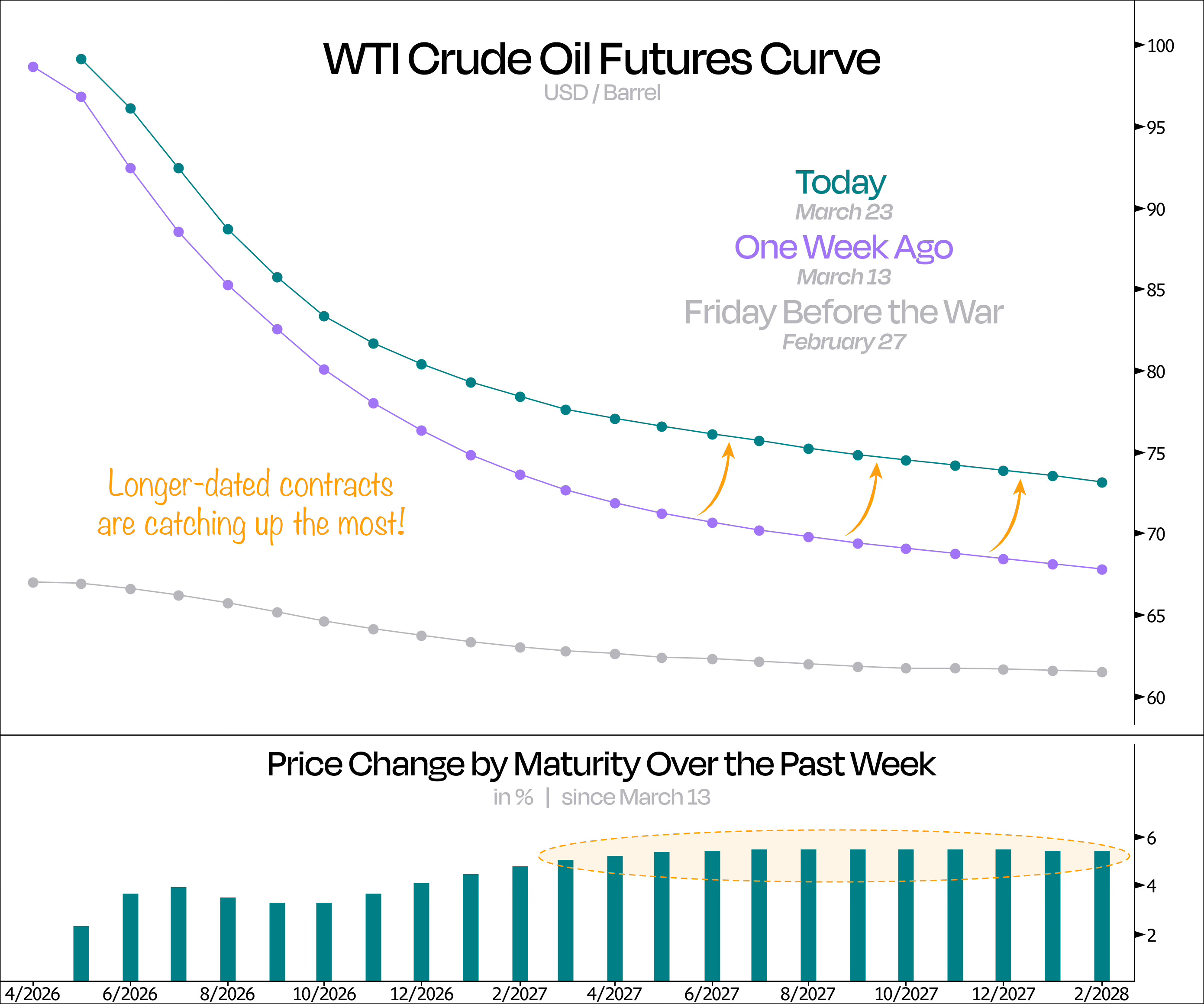 A quick look at our first chart shows that markets are increasingly treating this oil supply shock as something that’s here to stick around. This is especially clear when we look at how prices moved along the oil futures curve last week: even though front-month prices dipped slightly, longer-dated contracts moved notably higher.