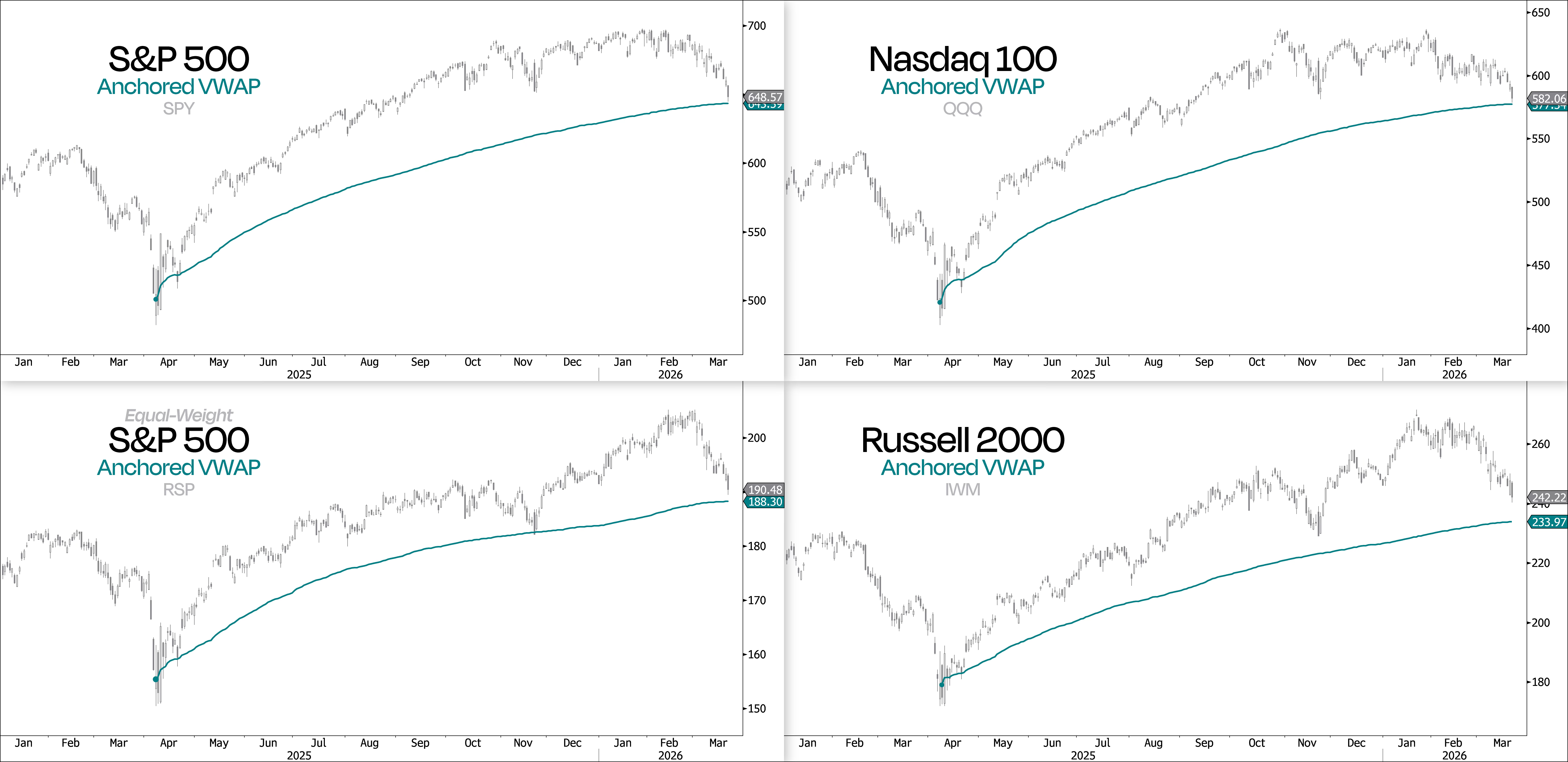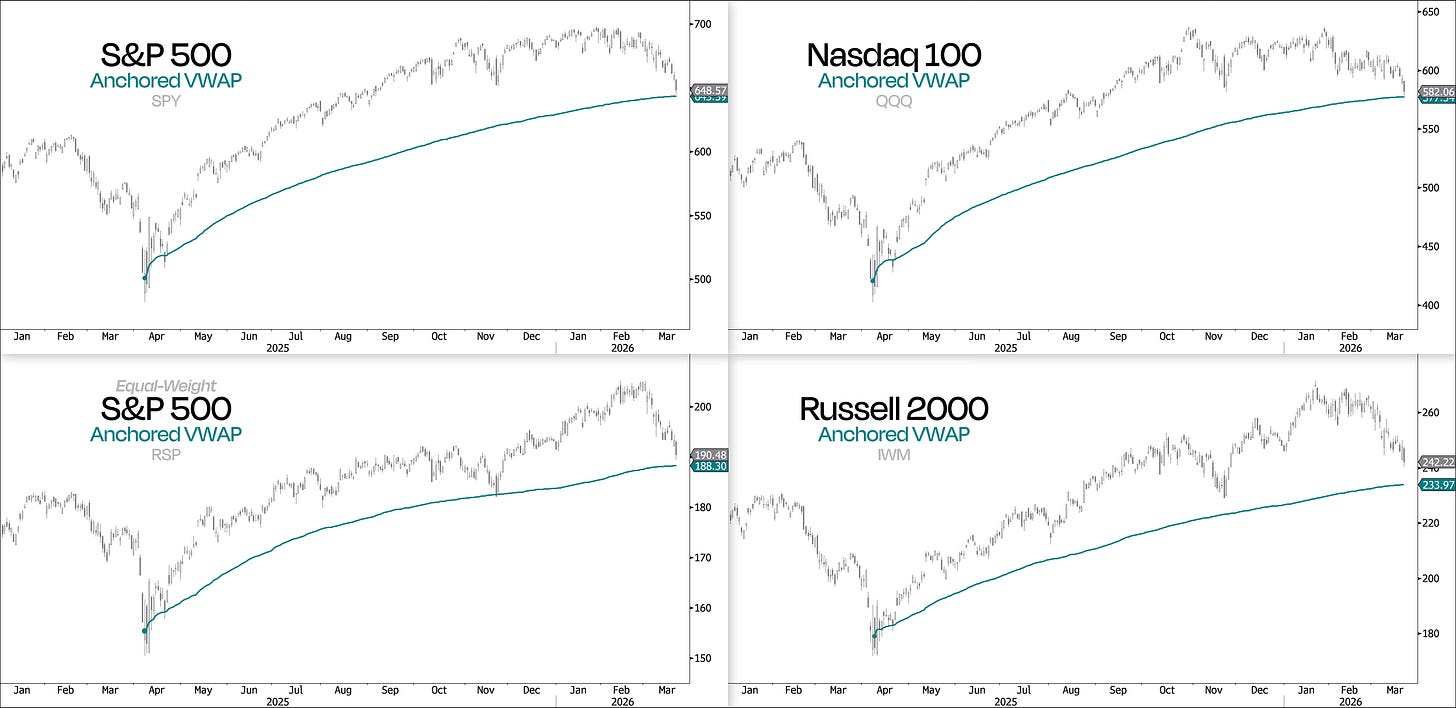 And interestingly, the Nasdaq 100, the equal-weight S&P 500, and the Russell 2000 are all showing a similar setup when you look at their anchored VWAPs from last year’s tariff selloff lows.