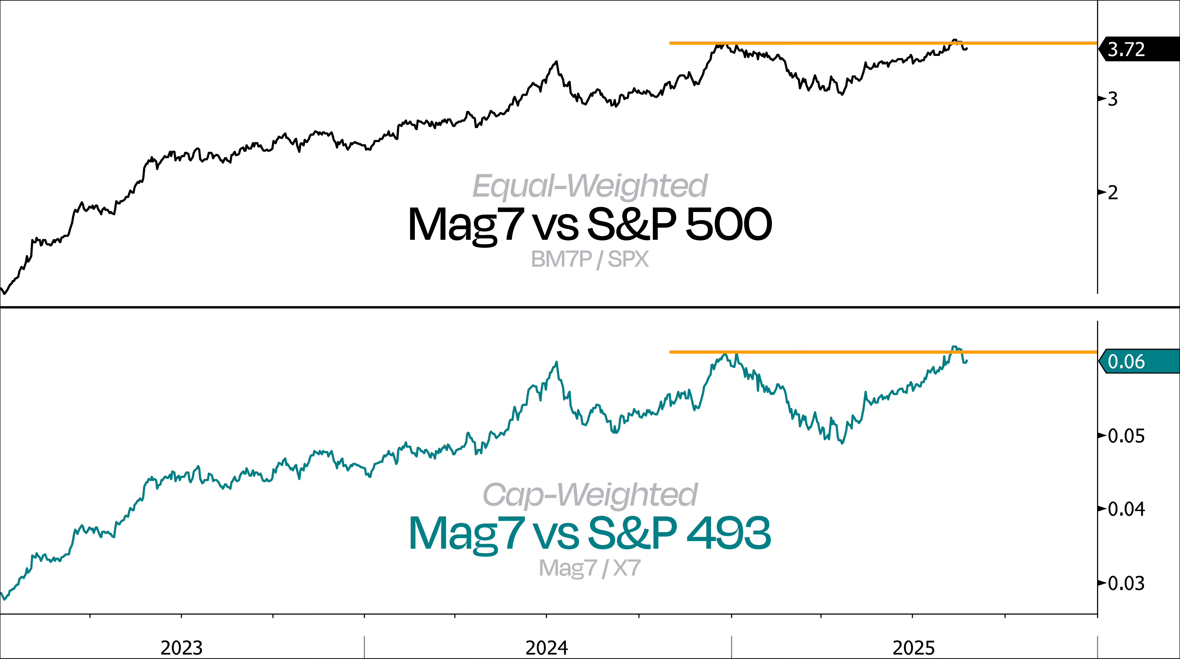 The top panel shows the Mag 7 vs the S&P 500 on an equal-weight basis. The bottom compares the cap-weighted Mag 7 to the X7 Index (basically the other 493 names in the S&P, also cap-weighted).