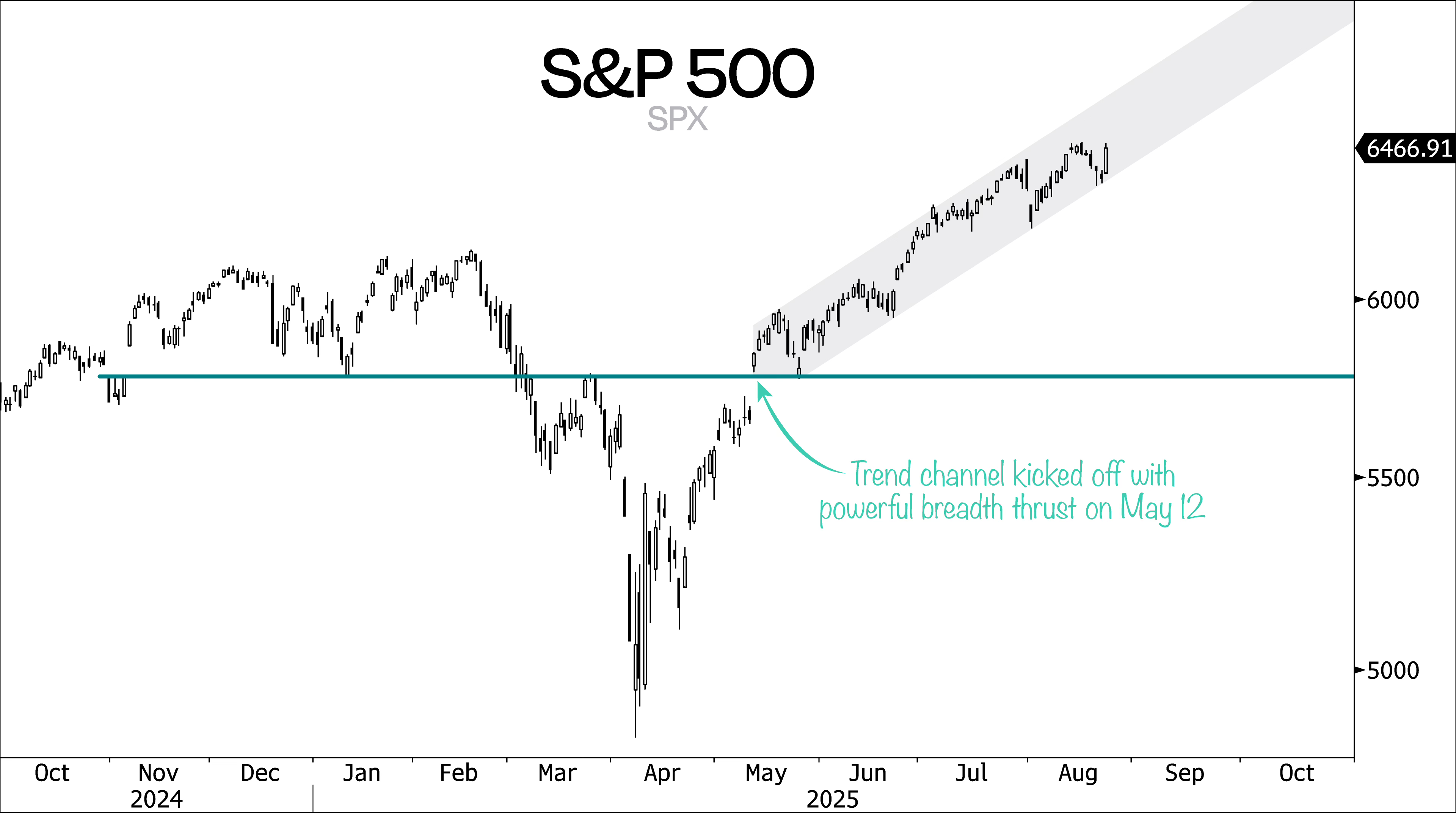 What still stands out most to us is the remarkable persistence of the trend channel that began with the powerful breadth thrust on May 12. Since then, the S&P 500 has been climbing in a clear channel for 75 trading days now — that’s nearly a third of the trading year — at an annualized rate of change of close to 50%.