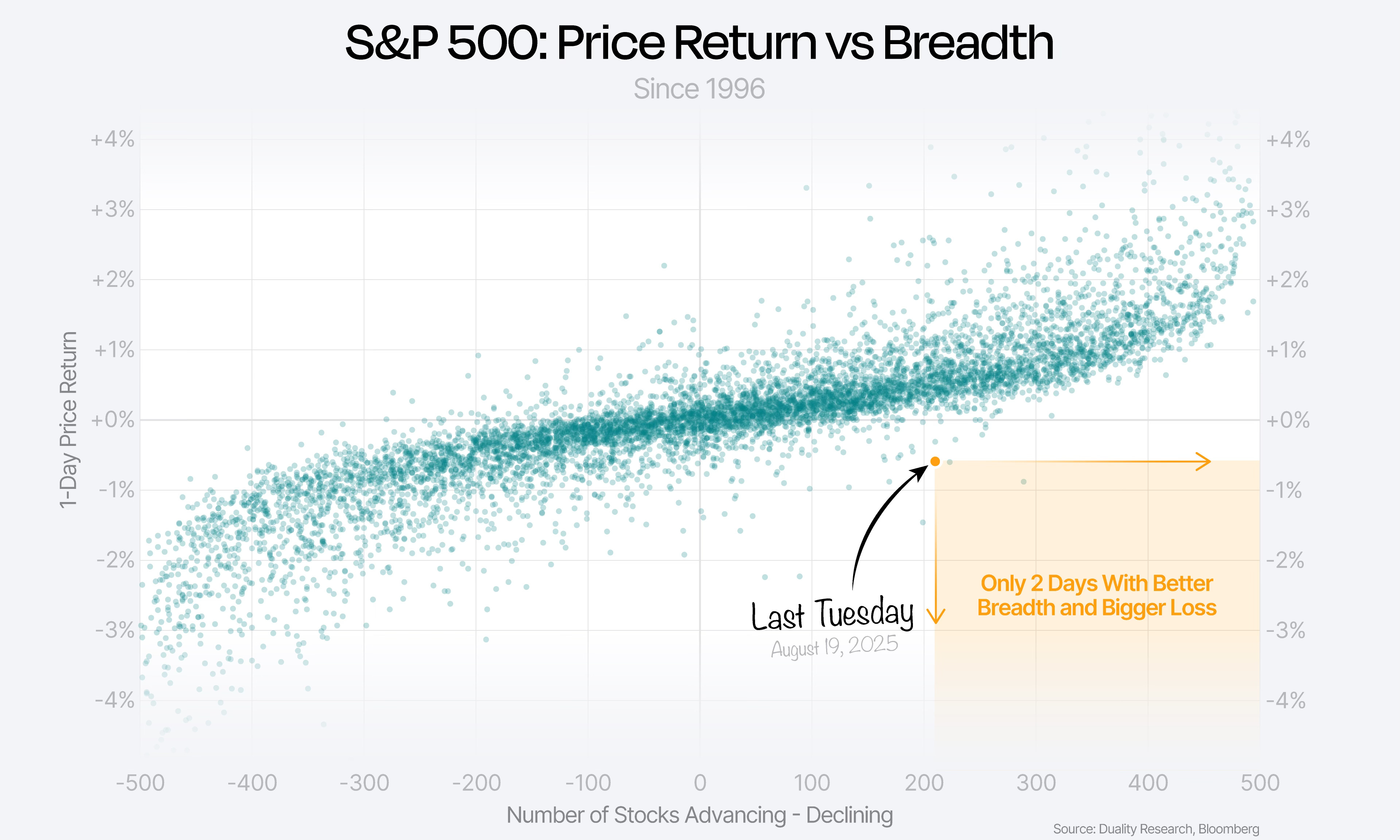 Since 1996, only two other days had stronger breadth with a bigger loss — the last one being July 11, 2024, right before Tech started underperforming the broader market for the next year.