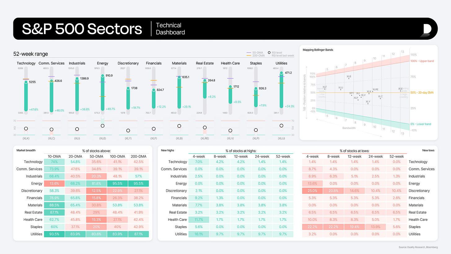 Top Left: The candlestick section shows a 52-week candle for each sector, including the standard open / high / low / close, plus the 1-year performance and the 50-day and 200-day moving averages. Right below that is the current RSI, along with the value from a week ago for context.